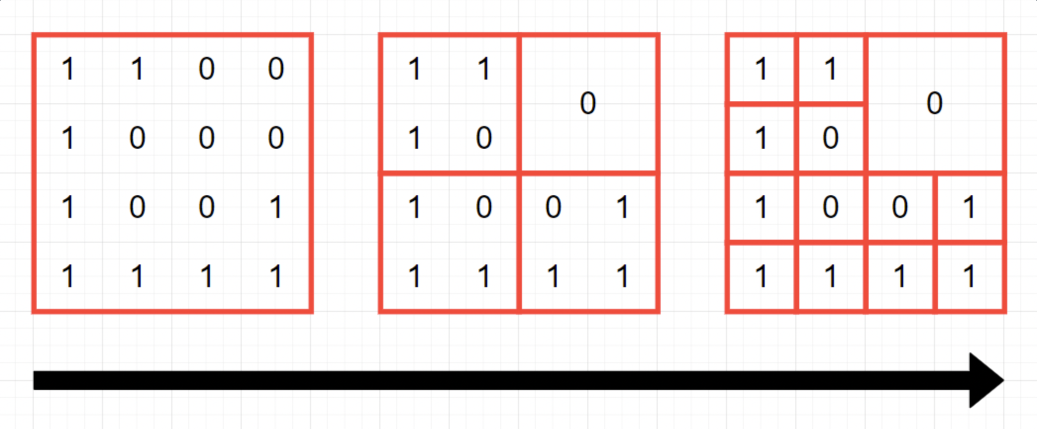 4개의 영역으로 나누고, 각 영역에 대해서 모든 요소가 1 또는 0인지를 판단하는 과정이 계속 반복되기 때문에 재귀함수를 활용해서 각 영역의 크기가 1이 될 때까지 반복해서 로직을 수행하도록 해주었다.