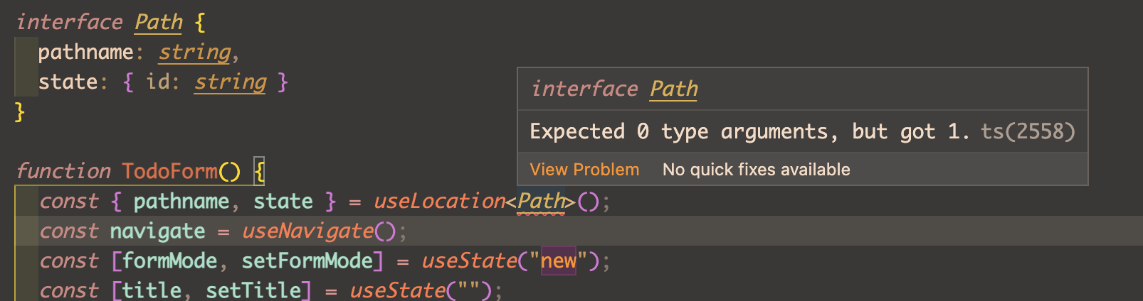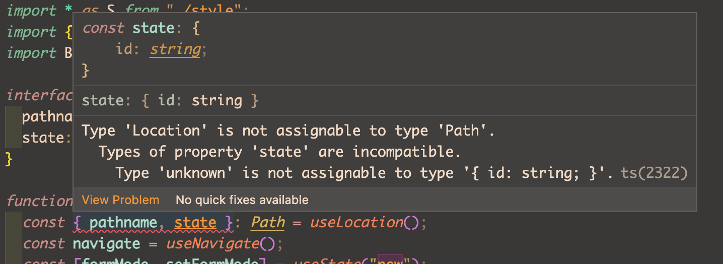 여기서 문제가 발생했는데 기존에 타입을 지정하는 방식대로 pathname과 state를 지정해주었을 때 타입과 관련한 에러가 발생했다.