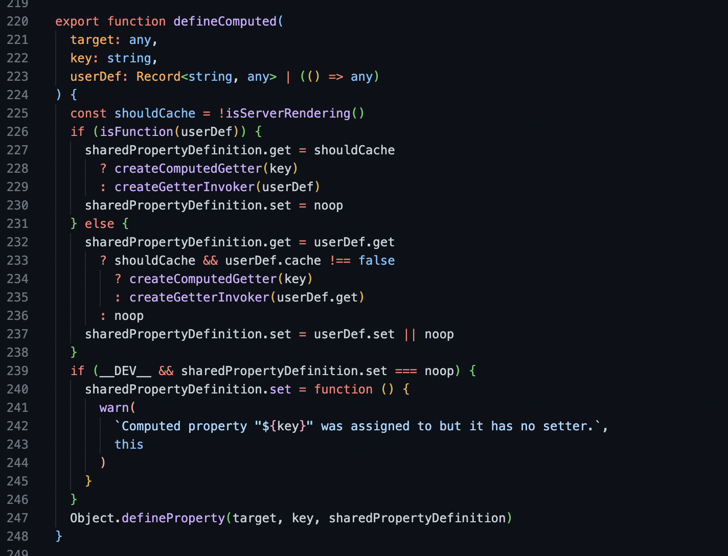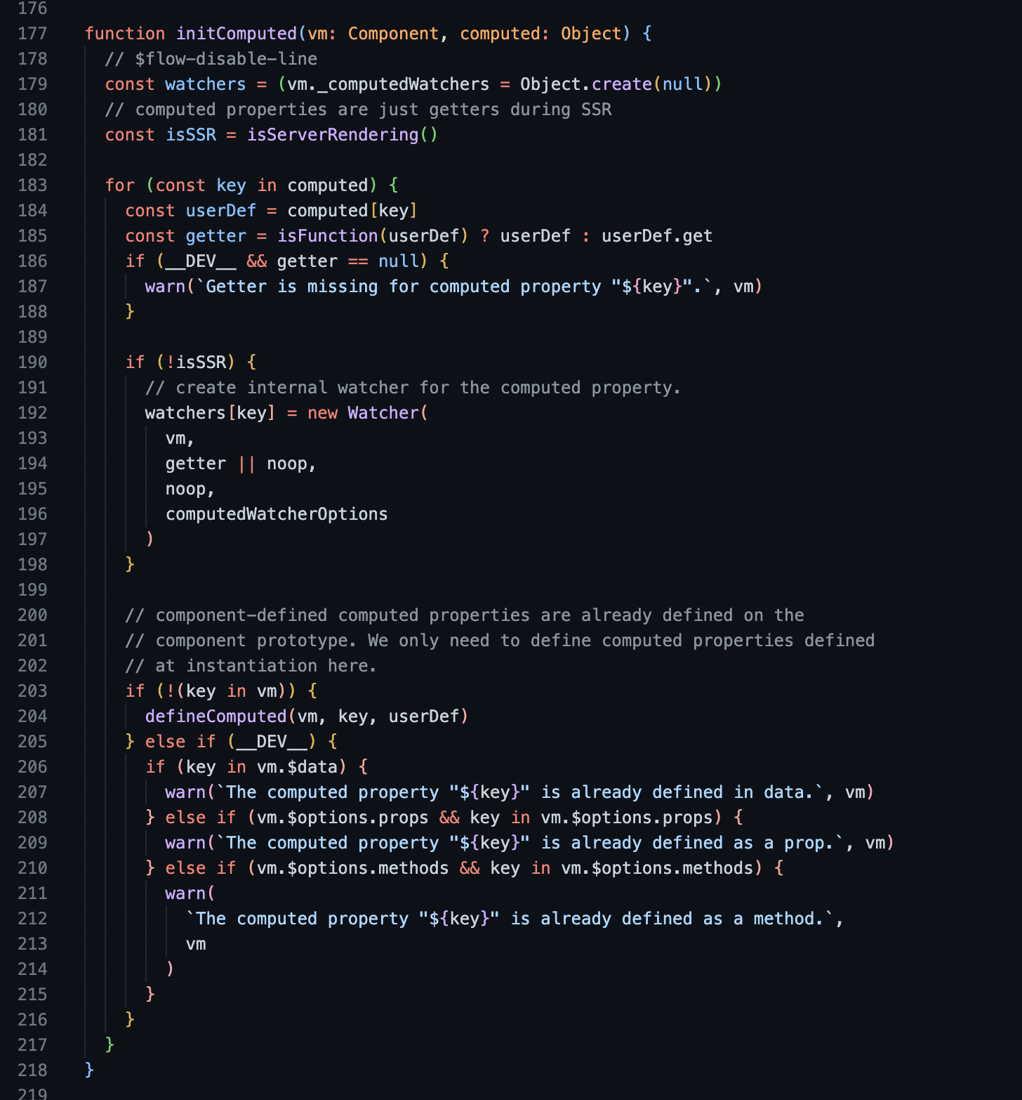 → 203번째 라인은 다른 data, props, method에 동일한 이름의 메소드, 변수가 있는지 체크해주고, 이상 없을 경우 computed로서 정의해주는 로직으로 이해했다.