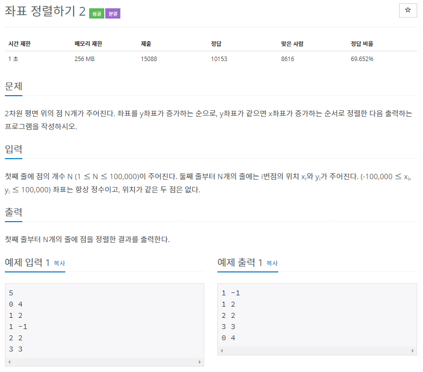 이상 11650, 11651번 좌표 정렬하기 문제였습니다!
