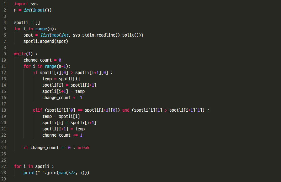 리스트 내 좌표들이 제대로 정렬되어 이동하지 않을 때까지 while 문으로 반복시켜 주었습니다.