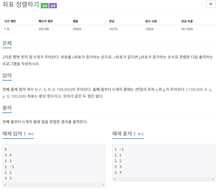 백준 11650번, 11651번 좌표 정렬하기 문제입니다.