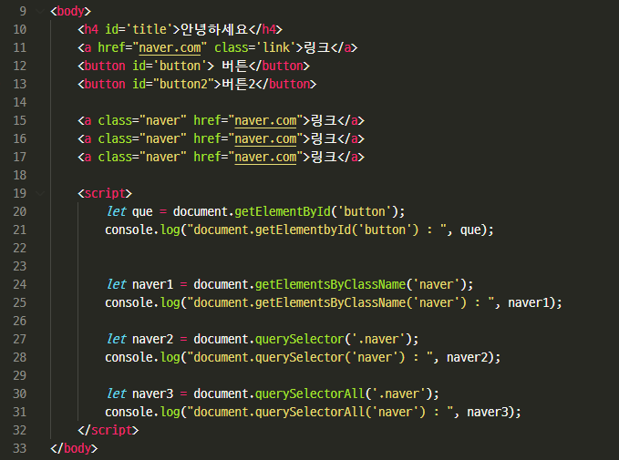 먼저 querySelector, getElementbyId, getElementbyClassName을 각각 사용해 보았다.