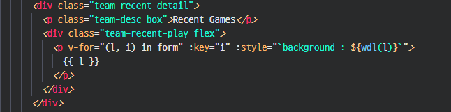 처음 작성한 대로 10경기의 결과가 form 변수에 저장되어 있고, v-for를 통해 하나씩 불러오면서 적절한 디자인을 적용시켜 찍어 주었다. ( 10경기에 대한 데이터가 제대로 저장되는 부분은 확인했습니다. )