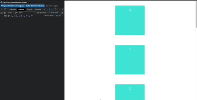 초기 컴포넌트를 10개 선언하고 무한 스크롤로 인해 컴포넌트가 계속 생성되도록 실습을 진행해 보았습니다.